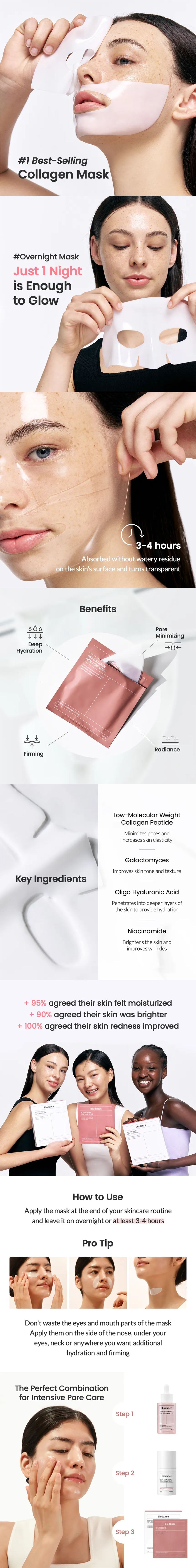 Water, Collagen Extract, Galactomyces Ferment Filtrate, Glycerine, Acrylates Copolymer, Niacinamide, Ceratonia Siliqua (Carob) Gum, Chondrus Crispus Extract, Betaine, Algin, Dipropylene Glycol, Agar, Hydroxyacetophenone, 1,2-Hexanediol, Potassium Chloride, Polyglyceryl-10 Laurate, Caprylyl Glycol, Sucrose, Butylene Glycol, Allantoin, Ethylhexylglycerin, Hydrolyzed Hyaluronic Acid, Adenosine, Disodium EDTA, Pyrus Communis (Pear) Fruit Extract, Rosa Damascena Flower Water, Iris Florentina Root Extract, Cucumis Melo (Melon) Fruit Extract, Hedera Helix (Ivy) Leaf/Stem Extract, Dipotassium Glycyrrhizate, Bifida Ferment Filtrate, Tocopherol, Lactobacillus Ferment, Lactobacillus Ferment Lysate